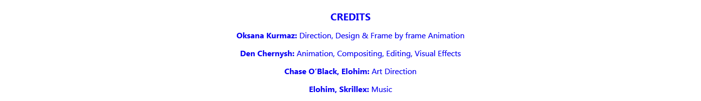 I was lucky enough to be a director of this animated video for Elohim and Skrillex. This music video was released on OWSLA label. This is hand-drawn animation mostly made with Toon Boom and Photoshop. My role was to create script, storyboard, animatic, character design and frame by frame animation. Thanks to Denis Chernysh for additional animation, editing, and compositing. Thanks, guys from Deckstar and OWSLA and especially to Elohim and Chase O'Black!